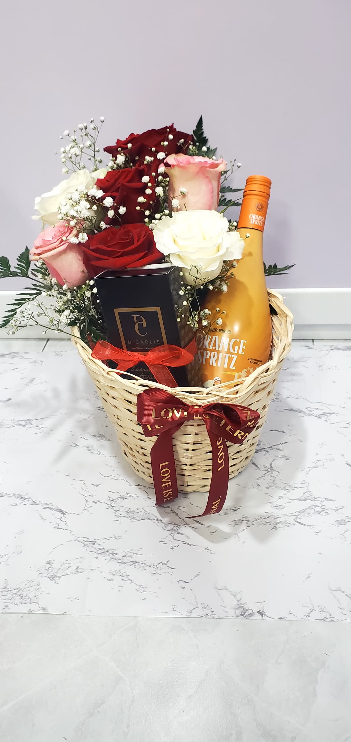 Cesta adornada con 7 rosas,follage,1 botella de Spritz y un estuche surtido de 10 bombones