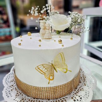 Panetela de chocolate, con nata de chocolate y virutas de chocolate blanco y chocolate con leche y números de chocolate.
