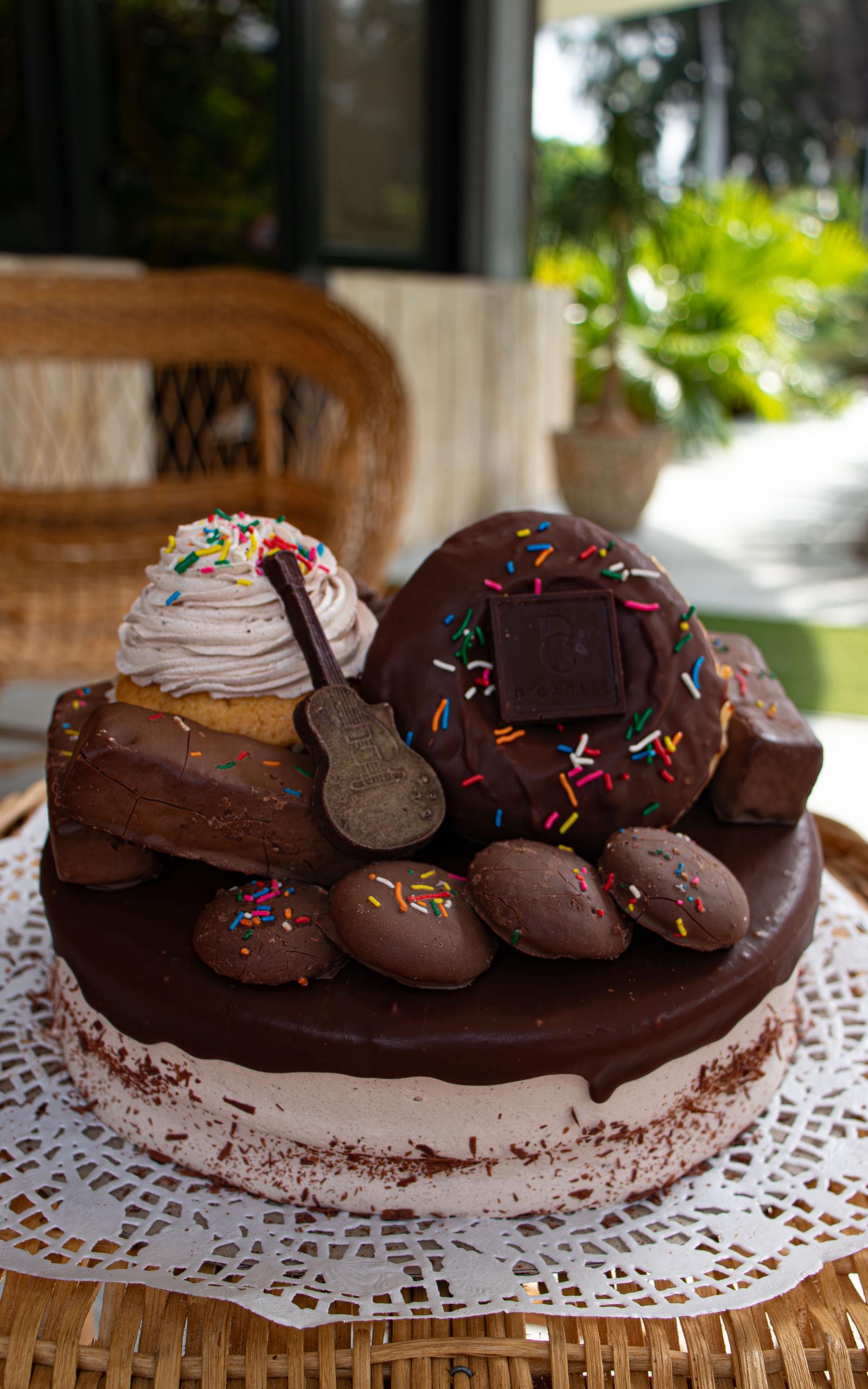 Panetela de chocolate o vainilla con nata de chocolate o vainilla a su elección respectivamente con confituras de chocolate y chocolate blanco, números de chocolate, barquillo, dona, cup cake y piruleta de chocolate.